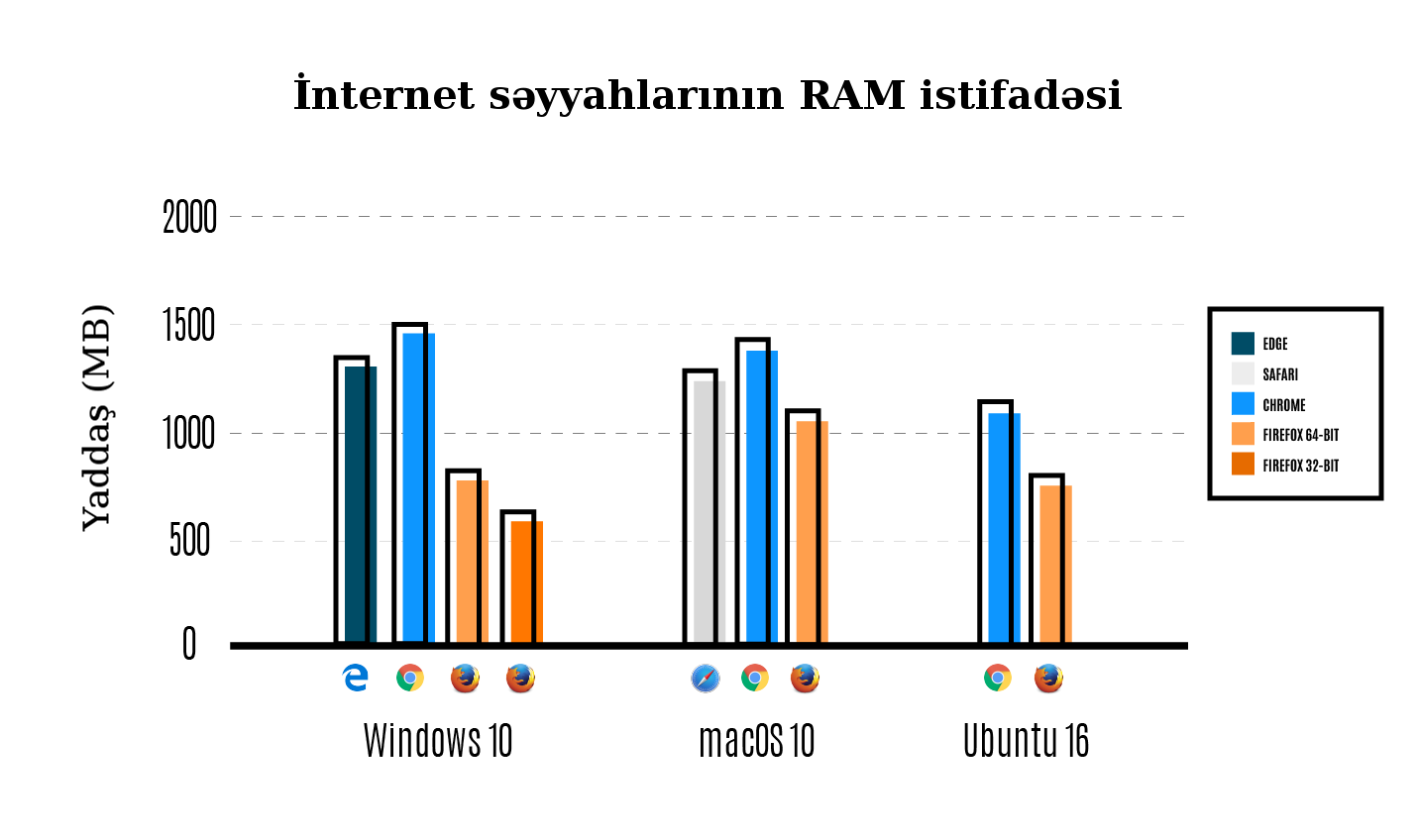Məşhur səyyahların yaddaş istifadəsini müqayisə etdiyimiz sınaqlarda Firefox-un Windows 10, macOS və Linux-da rəqiblərindən daha az RAM istifadə etdiyini müşahidə etdik. (RAM, Əməli Yaddaş Qurğusu mənasını verir və aktiv olaraq istifadə olunan proqramları saxlayan yaddaş növüdür.) Bu o mənaya gəlir ki, Firefox ilə internetdə azad şəkildə səyahət edərkən, kompüterinizdəki digər proqramları işlətmək üçün də daha çox RAM-ınız qalır.